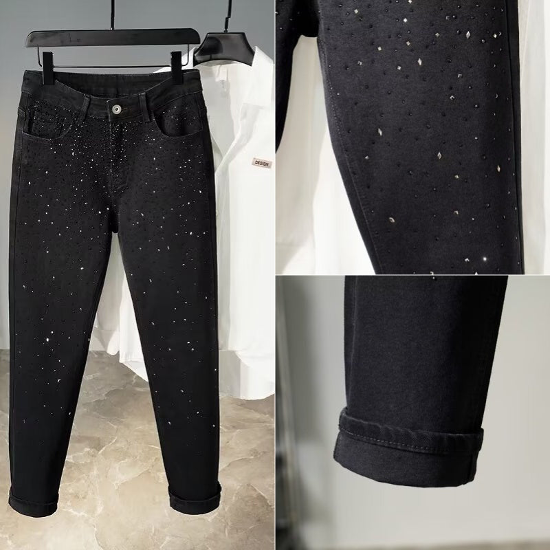 Rhinestone Embellished Slim-Fit Black Denim Jeans