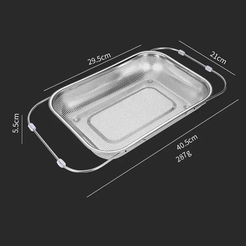 ADJUSTABLE FIT FOR VARIOUS SINKS: Features a telescopic dual-ear design that expands and contracts to fit different sink sizes. Equipped with non-slip silicone dots that securely grip sink surfaces, preventing movement during use and ensuring stability while washing or draining.
